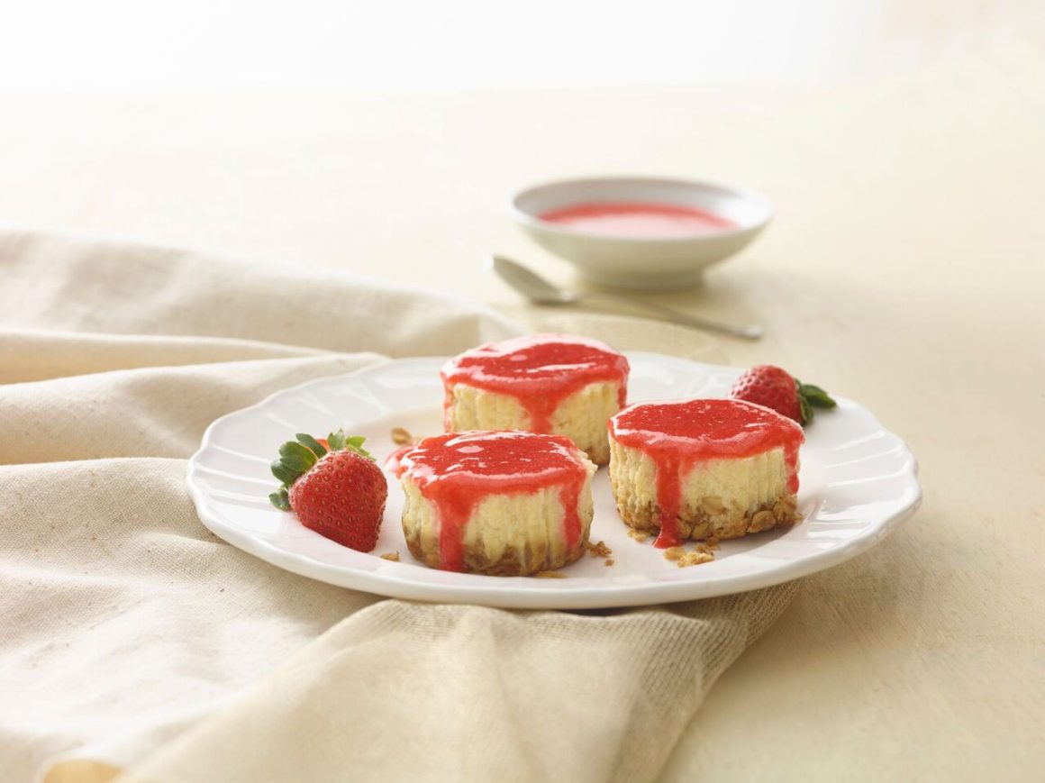 Serve the mini cheesecakes with a spoonful of strawberry purée on top or on the side. Garnish with sliced fresh strawberries, or other berries, if desired.