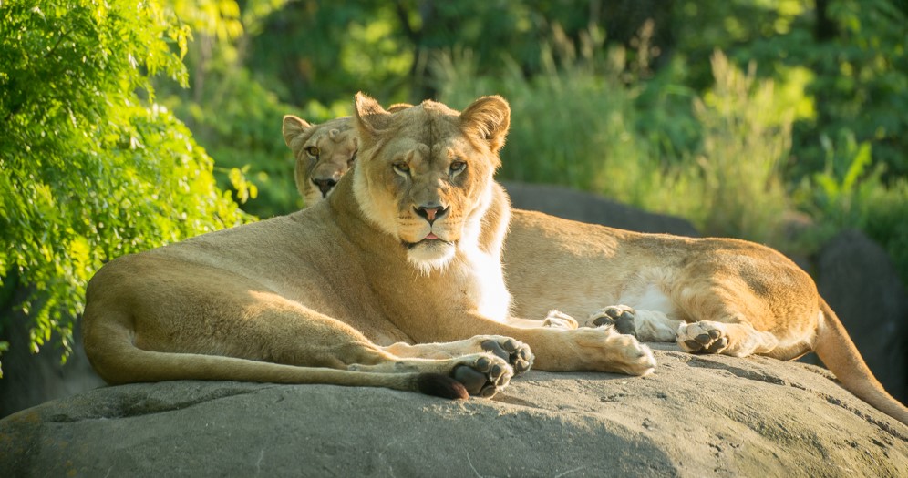PHOTO: Two female lions relax on their rock at Predators of the Serengeti. Every day this summer, zookeepers will demonstrate how they keep the lion pride healthy. Photo by Shervin Hess/Oregon Zoo.